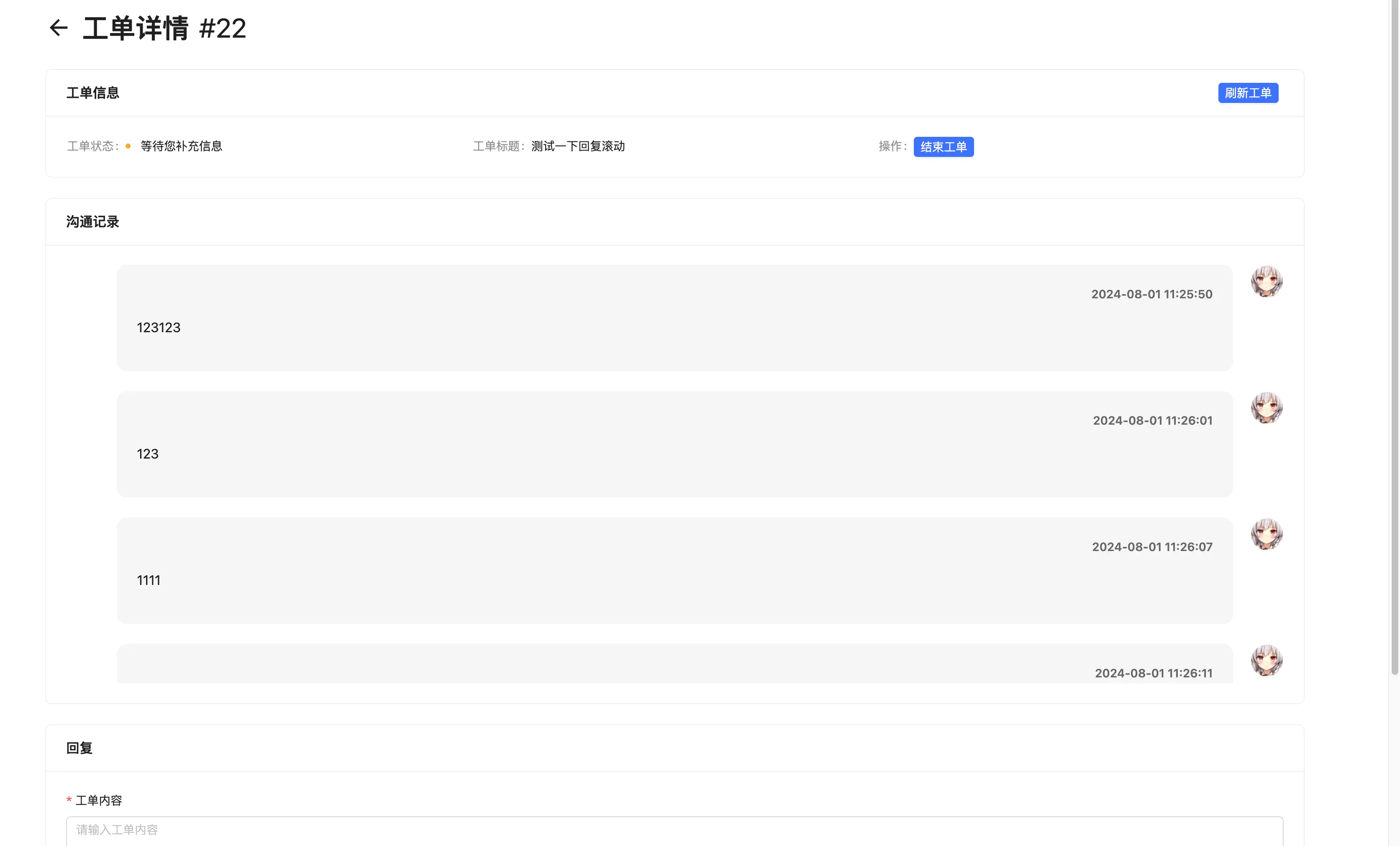 当前工单系统分了三个区域,工单信息区/工单信息展示区(沟通记录)/用户回复区。